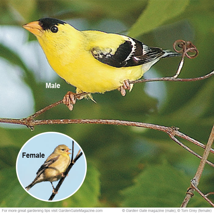 Since it rarely eats insects, the American goldfinch flocks to nyjer and hulled sunflower seed-filled feeders and seedheads of plants like coneflower (Echinacea spp. and hybrids) and black-eyed Susan (Rudbeckia spp. and hybrids).