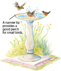 Some types of birdbath are more attractive to birds, and safer for them, than other designs. Shallow, rough-surfaced, tall birdbaths are best. Birdbaths should be no more than 2 in. deep so birds of all sizes can use them. If your birdbath is deeper than that, place pea gravel or a flat stone in it to make a shallow spot for small birds.