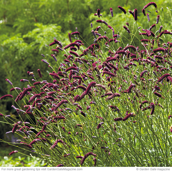 Dress up your fall garden with this unique perennial! Distinctive leaves — gray-green with a scalloped edge — and bobbing wine-purple blooms make burnet (Sanguisorba tenuifolia) the perfect addition to any late-season bed or border. It can easily reach up to 4 feet tall or more, but the airy catkins, or flower clusters, won’t block your view. Pair it with ornamental grasses and wildflowers for an informal look. Its long-lasting blooms keep their color, lingering on the stems to add winter interest, too.