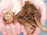A couple of times during the winter, remember to check on the summer bulbs that you’ve stored in your basement to make sure they’re not drying out or rotting. Check the temperature — it should be around 45 to 50 degrees. Pull out a few bulbs to see if they’re moist enough. Bulbs that have dried out and are starting to shrivel need to be misted with water. The gladiolus bulb on the left is too dry and will have to be thrown away. Click on the photo for a larger version.