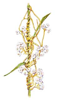 The seeds germinate in the soil, and the seedlings bend to find a host plant. If they don’t find one, they die. When the search is successful, the connection to the soil breaks and the seedling fastens onto the host to begin feeding. It reaches for more plants, branching and spreading rapidly, eventually strangling and exhausting them. Small, white flowers bloom throughout the growing season, producing hard-coated seeds that can quickly germinate.