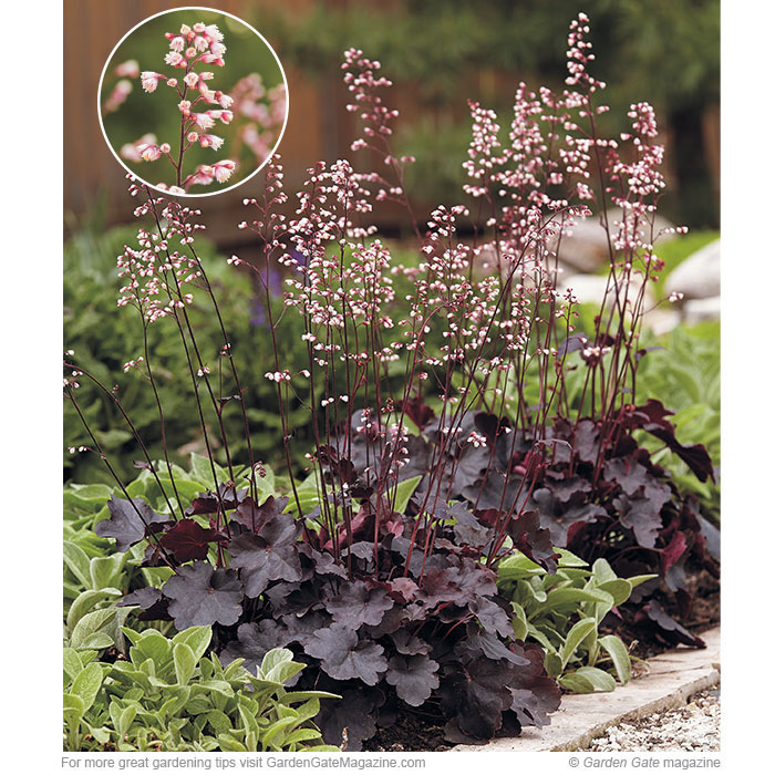 Look closely at left and you can see that the large, dark purple-black scalloped leaves have red-purple undersides. This hue deepens in some sun and makes a stunning combination with complementary color yellow-green. Its hot pink buds open pale-pink to white, like you see in the inset, on deep red scapes in spring to early summer.