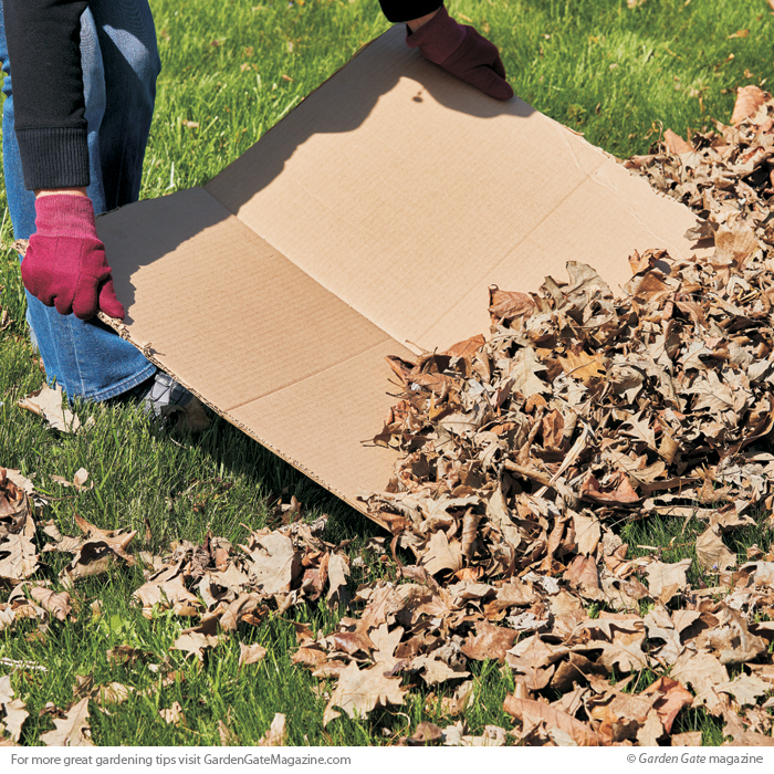 Make quick work of a yard full of leaves with a sturdy piece of cardboard. Using it like a snow shovel, push a wide swath of new fallen leaves into piles. Do a fast pass across the lawn every day or two before leaves pack down or get rained on to keep them all together until you have a chance to bag or move them to the compost pile.