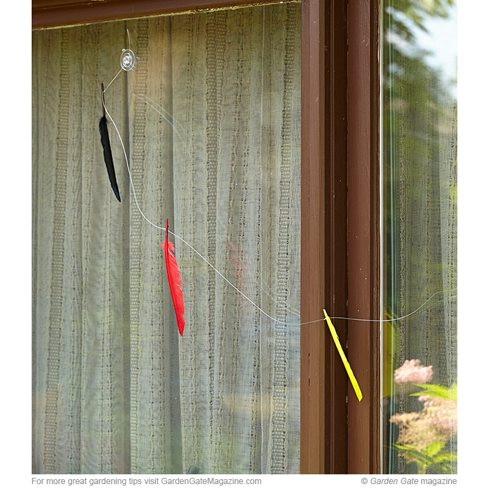 This string of brightly colored costume feathers hangs from two suction cups. Its loose, dangling feathers act as a warning sign to birds, indicating a predation incident has taken place. Just stick it to any problem window to keep birds away and safe.