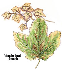 IDENTIFICATION — If your maple looks like someone used a torch on the leaves — especially near the top and on the southern side — your tree is probably suffering from leaf scorch, a direct result of dry summer heat. Trees transpire, like we do when we sweat, and if they lose more water than the roots can absorb, the leaves may scorch.