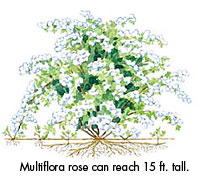 A single multiflora plant can grow upwards of 15 ft. tall and produce a million seeds that can last 20 years. It also multiplies by suckers or when its sprawling stems arch down to the ground and take root. Because of its unstoppable growth, it’s illegal to sell multiflora rose in several states. Check with your state’s Department of Natural Resources, or in Canada, with Natural Resources Canada at www.nrcan.gc.ca.