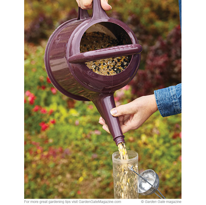 Instead, pour or scoop birdseed into a clean, dry watering can and remove the sprinkler head. Then hold it over the feeder and pour in the seeds, just like you see at left.