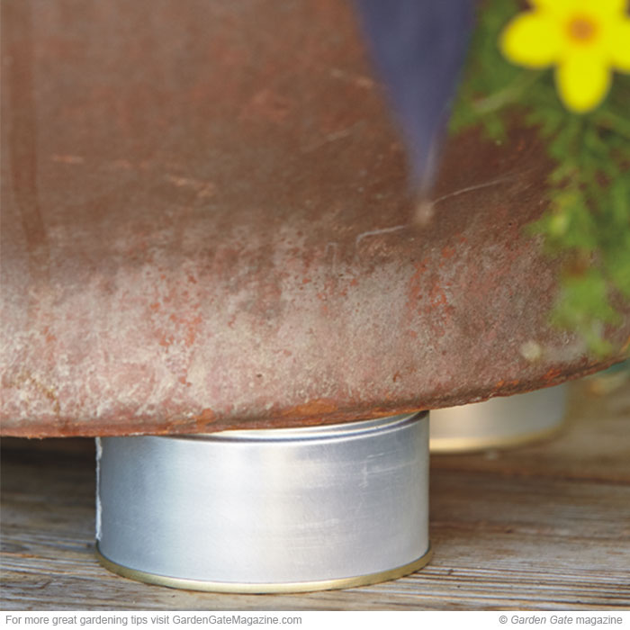 Turn three or four 3-oz. cat food cans upside down as a platform for pots, like at left. Tuna cans would also work. This minimizes contact with the surface below, helping water drain quickly during the season.
