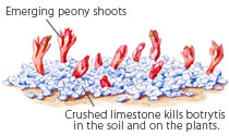 If you live where the soil is acid, one way to prevent botrytis is to keep the crown and soil around it covered with a 1-in.-thick layer of limestone. It neutralizes the acid and helps kill the botrytis, which waits in the soil and coats the peonies as they emerge. This alkaline element also helps release chemical nutrients that can be “locked up” in an acid soil, helping the plant get growing again after its winter dormancy. Be sure to use pea gravel-sized crushed limestone, calcium carbonate, not the powder that’s used on lawns.