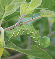 IDENTIFICATION — These 3- to 5-in.-long giants of the caterpillar world have a large harmless spike, or horn, on their tails. Their green color blends into the foliage of tomato and tobacco plants, some of their favorite foods. They will also attack plants in the nightshade family, such as datura, petunia and nicotiana.