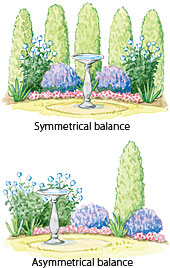Asymmetrical balance is also organized and stable, but the visual weight of the elements looks more random. In the illustration at right, the tall evergreen and mounded shrubs are balanced with the airy, open perennials and the off-center birdbath on the left. Use asymmetrical balance to create casual landscapes.