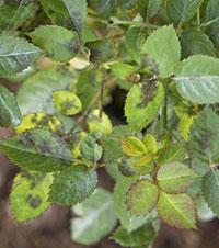 IDENTIFICATION – The name says it all. This fungal disease causes black spots with fringed margins and a yellow halo on leaves. Infected leaves drop early, often leaving the plant almost bare. Blackspot doesn’t kill roses, but it weakens them, making them susceptible to insects, cold and other diseases. Warm, humid summers make blackspot worse.