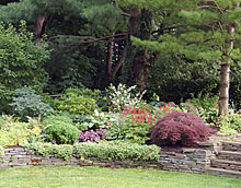 See how the striking color of this Japanese maple attracts your gaze? Choosing and framing focal points effectively is all about using contrast. If the tree were the same green as the rest of the scene, even with its large size, it wouldn’t be as striking. Its color is the visual “hook” that demands attention and stimulates interest. Additionally, the curving line of the bed’s edge leads your eye to the tree. The colorful plants at its base give the setting even more interest.