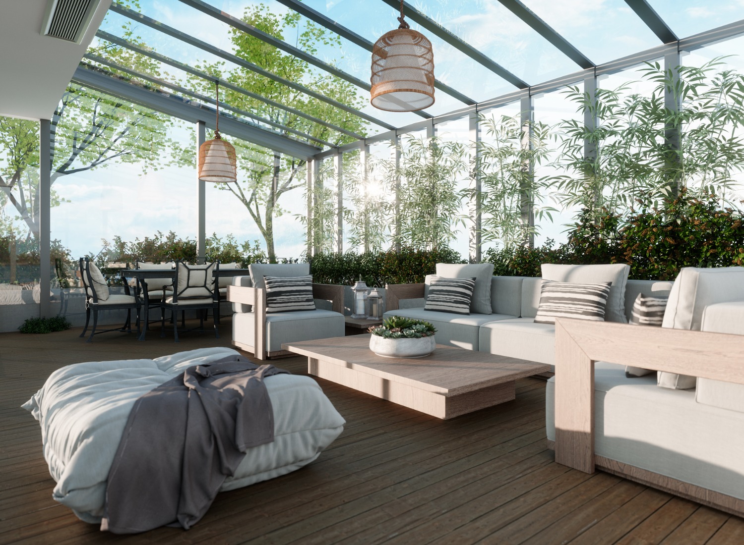 For those who wish to bask in natural light during the day and stargaze at night, a transparent glass roof is the perfect choice. Using tempered, tinted, or frosted glass can also provide privacy while allowing light to permeate. Wooden or metal beams can add structural integrity and design flair. This elegant solution ensures your patio is usable all year round, offering a unique blend of indoor luxury and outdoor expansiveness, making your property especially attractive to potential buyers.